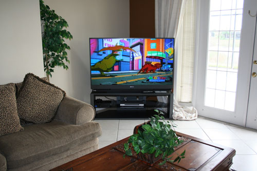 features 60" high definition TV, DVD and VCR and has a truly breathtaking view